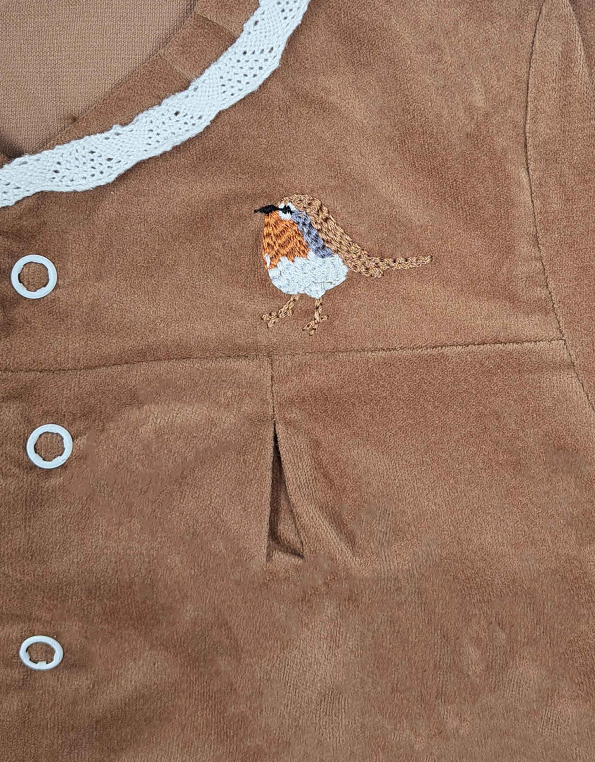 این مدل از پوشاک بچه گانه با جنس مخملی نرم و گرم، طراحی فانتزی گنجشک و دوخت ظریف،